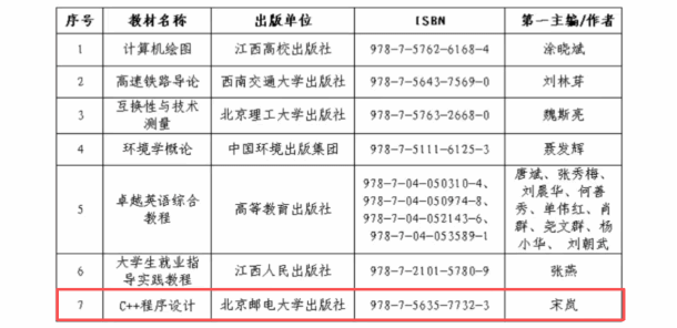 近日,江西省教育厅发布《关于公布江西省普通高等教育本科省级规划教材入选名单的通知》(赣教高字[2026]7号),明星ai换脸 宋岚老师主编的《C++程序设计》成功入选第二批江西省“十四五”普通高等教育本科省级规划教材。